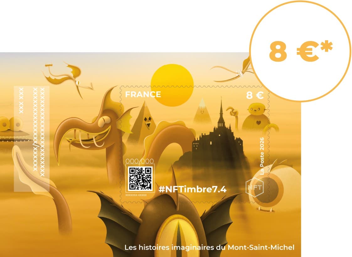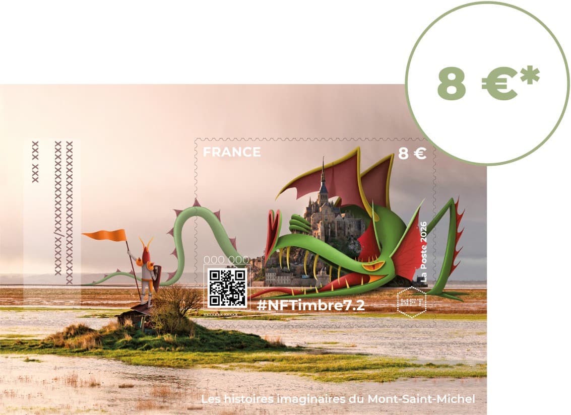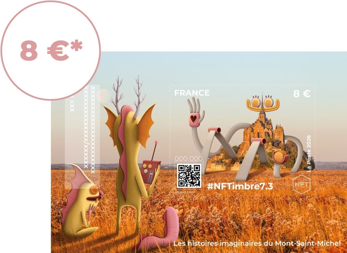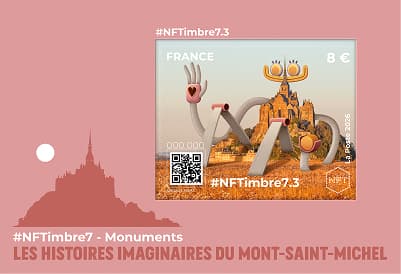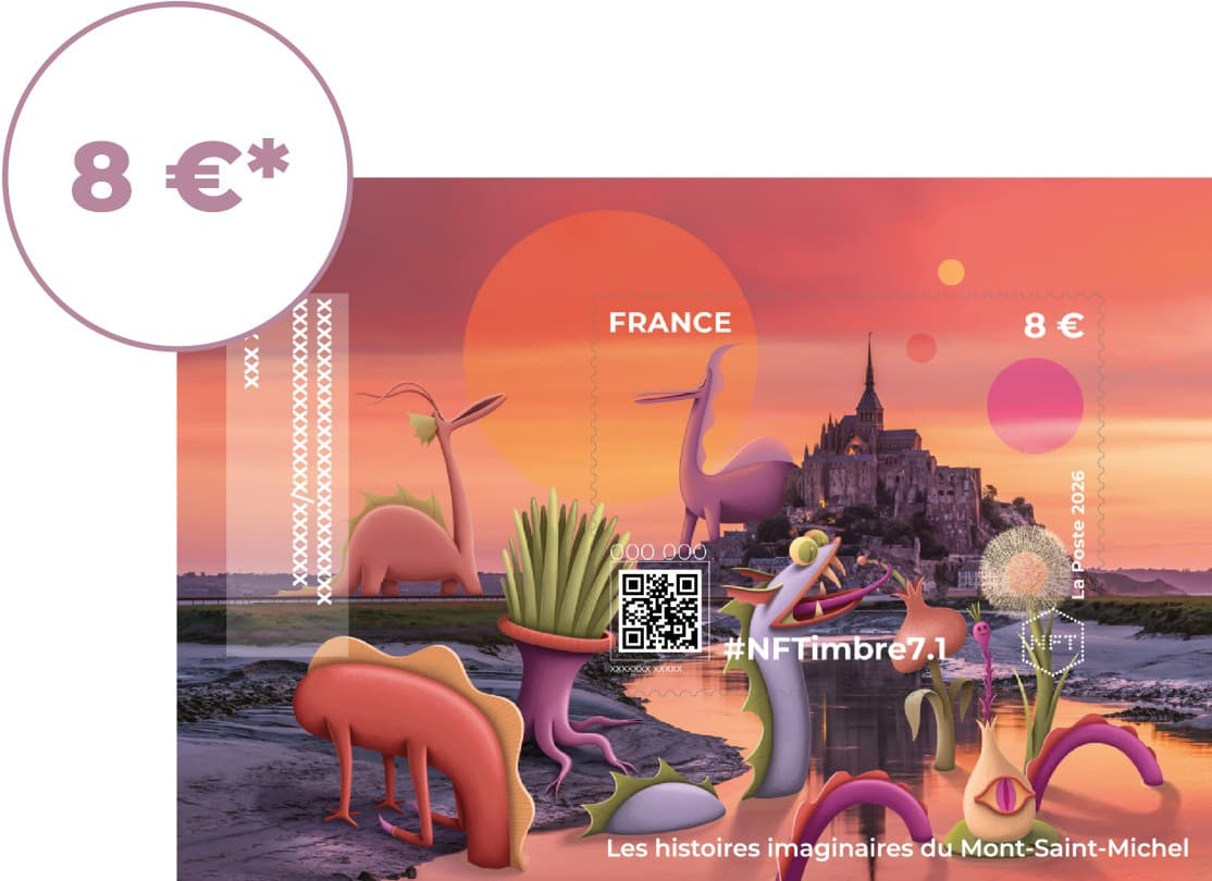 Pour cette nouvelle série #NFTimbre7 – Monuments, La Poste confie à l'artiste Nicolas Barrome-Forgues une réinterprétation poétique et contemporaine du Mont-Saint-Michel. Chaque timbre porte un nouveau récit, à hauteur d'enfant, où l'imaginaire devient une autre façon de regarder le réel.